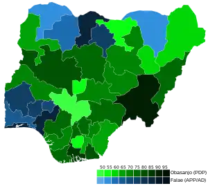 ![]() States won by Obasanjo (in green), and Falae (blue) | ||||||||||||||||||||