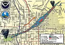 The 1999 Salt Lake City tornado was a rare tornado that struck downtown Salt Lake City, Utah, United States, on August 11, 1999. It was among the most notable tornadoes to hit west of the Great Plains in the 20th century and the second tornado to hit in Utah that resulted in a fatality (the other occurring in 1884).[3] This was the sixth significant tornado in Utah since June 1963,[4] and one of only two F2 tornadoes to have hit Salt Lake County since 1950 (the other occurring on February 9, 1965, in Magna).[5][6]