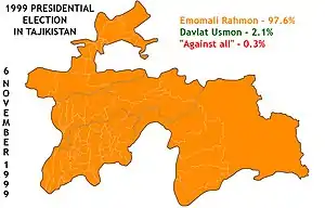 Presidential elections were held in Tajikistan on 6 November 1999. They were won by the incumbent, Emomali Rahmonov, who received 98% of the vote. The opposition, who had demanded the elections be postponed,[1] and planned to boycott them (but reversed their decision a few hours before voting began), described the result as illegal.[2] Foreign observers were also critical of the elections, particularly regarding the issues of candidate registration, media access and voting irregularities, including multiple voting.[3]
