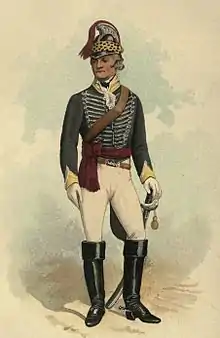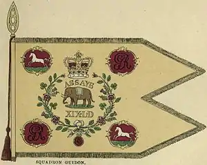 The regiment was raised by Colonel Sir John Burgoyne (a cousin of General John Burgoyne) as the 23rd Regiment of Light Dragoons on 24 September 1781 for service in India.[2] There had been no European cavalry to that date in India, and successive commanders there had called upon the regular British Army to supply a cavalry unit.[3] The regiment arrived at Fort St. George, Madras in 1782 and became the first British cavalry regiment to serve in India.[4] In 1786, the regiment was renumbered as the 19th Regiment of Light Dragoons.[2][5]