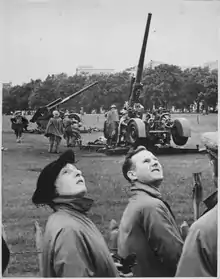 On 5 June 1940, after the British Army had been evacuated from Dunkirk and the Battle of Britain was about to start, the 1st AA Division comprised 45 4.5-inch, 39 3.7-inch and 26 3-inch HAA guns, with three 3-inch, 19 Bofors, three twin Vickers and 185 LMGs in the LAA role, together with 240 90 cm searchlights.[19] On 11 July, the division's guns were disposed with 92 defending London, 28 at Slough, 4 at Hounslow, 4 at Stanmore, and 34 others dispersed to VPs.[20]