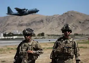 Paratroopers assigned to the 1st Brigade Combat Team, 82nd Airborne Division conduct security detail at Hamid Karzai International Airport during Operation Allies Refuge in 2021.