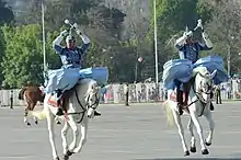 In 1999, the regiment was relocated to its current stables in Camp San Isidro in the western city of Quillota, Valparaíso Region, wherein it was reassigned the duties of being the travelling escort to the President, merging the Mounted Ceremonial Troop to it.[2] Today it maintains the primary purpose of protocol and ceremonial public duties as the most senior regiment of cavalry of the modern day Chilean Army, and one of only 2 regiments left standing in the role of mounted cavalry. Alongside being the travelling escort unit, it maintains guards at the Plaza de la Ciudadanía in Santiago monthly for flag raising ceremonies held there. The regiment's change of command ceremony is the only one in the army wherein most of it is done while mounted, reflecting the long traditions of the Chilean Army cavalry.[3]