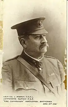 The companies were responsible for manning the batteries of fixed coastal guns of the Tees (4 x 6-inch guns, 2 x 4.7-inch guns) and at Hartlepool (3 x 6-inch), while the heavy battery was mobile and responsible for the landward defence of the batteries (heavy batteries were usually armed with obsolescent 4.7-inch guns).[19][20] The commanding officer was Lt-Col Lancelot Robson, a doctor and former mayor of Hartlepool, who had first been commissioned into the 4th Durham RGA in 1893.[5]