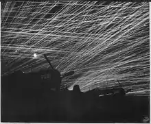 ![]() Anti-aircraft fire from Marine AAA Battalions in the vicinity of Yontan Airfield lace the sky during the Battle of Okinawa. | |