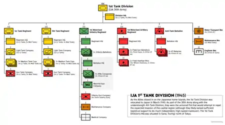 The 1st Tank Division, after being relocated to Japan in 1945, consisted of a division headquarters, two tank regiments (roughly battalion-sized), one motorized infantry regiment, one motorized artillery regiment, one anti-tank battalion, one motor transport battalion, one maintenance battalion, and one engineer battalion.[3]