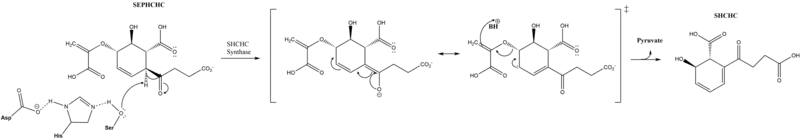 Reaction scheme for conversion of SEPHCHC to SHCHC by SHCHC synthase.