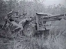 In September 1942, as fighting on the Kokoda Track intensified, the regiment deployed to New Guinea along with the 25th Infantry Brigade. It was initially deployed to defend against an advance on Port Moresby until February 1943, when they moved to Dobodura; with batteries deployed to Simeni, Soputa and the Kumusi River, the regiment's main role was to support troops mopping up isolated pockets of Japanese troops left in the area following the Allied counter-offensive along the Kokoda Track, and in the aftermath of the Battle of Buna–Gona. Throughout April to September, the regiment detached several elements to support US troops as part of the Salamaua–Lae campaign,[7] landing at Tambu Bay during the Battle of Roosevelt Ridge;[8] during this time several troops operated 155 mm guns. The 12th Battery and part of the 56th also deployed in support of the 9th Division during the landing at Lae. After November, the regiment concentrated around Finschaffen as part of the 9th Division to support operations during the Huon Peninsula campaign; when the 4th Infantry Brigade began the advance on Sio, the 2/6th Field Regiment was switched to support them until January 1944, when the regiment handed over its equipment to the 2/14th Field Regiment and embarked for Australia.[7]