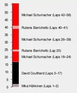 On the tenth lap, Coulthard ran off the track at turn six,[2] with grass penetrating his left-hand radiator inlet and blocking the hot air release pipes.[10][47] This increased the engine temperature in Coulthard's car,[6] and McLaren was forced to amend his race strategy when his engine overheated too much.[51] Further down, Gené lost 13th position to Alesi, as Trulli made a pit stop for further repairs to his car.[47][48] Coulthard had a 5.6-second lead over Michael Schumacher by the start of lap twelve, with Verstappen passing Button for tenth. Häkkinen moved up to 14th after passing Ralf Schumacher and Gené in the next three laps.[47][48] Salo and Alesi became the first drivers to make scheduled pit stops on lap 16.[47] Coulthard made an early pit stop one lap later to clear the debris from his radiator, resolving his overheating problem.[6][10][47] He rejoined the circuit in sixth.[2] The McLaren duo were on different strategies, with Coulthard making two pit stops and Häkkinen one.[45] Button became the race's next retirement when his engine failed on lap 19.[10][33] Michael Schumacher continued to set successive fastest laps, building an 8.8-second lead over Rubens Barrichello by the time of first pit stop on lap 24 after becoming concerned that Coulthard was quicker than him.[10][48] Barrichello led for one lap before his pit stop on the following lap returned Michael Schumacher to the lead.[47]