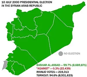 A presidential referendum was held in Syria on 10 July 2000,[1] following the death of President Hafez al-Assad. The candidate, chosen by the parliament, was his son, Bashar al-Assad, with voters then asked to approve or reject his candidacy. A reported 99.7% of voters voted in favour, with a turnout of 94.6%.[2]