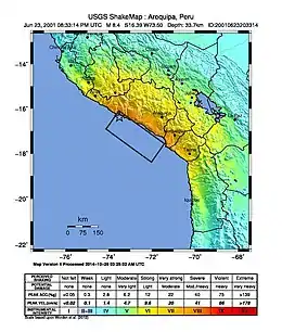 The 2001 southern Peru earthquake occurred at 20:33:15 UTC (15:33:15 local time) on June 23 with a moment magnitude of 8.4 and a maximum Mercalli intensity of VIII (Severe). The quake affected the Peruvian regions of Arequipa, Moquegua and Tacna. It was the most devastating earthquake in Peru since the catastrophic 1970 Ancash earthquake and globally the largest earthquake since the 1965 Rat Islands earthquake.