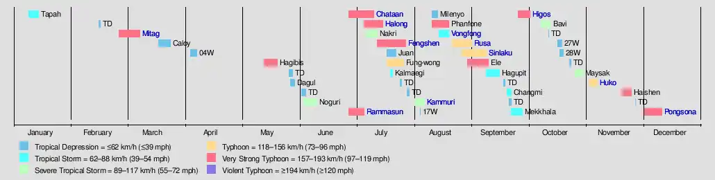The activity was an active season, with many tropical cyclones affecting Japan and China. Every month had tropical activity, with most storms forming from July through October. Overall, there were 44 tropical depressions declared officially or unofficially, of which 26 became named storms; of those, there were 15 typhoons, which is the equivalent of a minimal hurricane, while 8 of the 15 typhoon intensified into super typhoons unofficially by the JTWC. The season began early with the first storm, Tapah, developing on January 10, east of the Philippines. Two months later, Typhoon Mitag became the first super typhoon [nb 1] ever to be recorded in March. In June, Typhoon Chataan dropped heavy rainfall in the Federated States of Micronesia, killing 48 people and becoming the deadliest natural disaster in the state of Chuuk. Chataan later left heavy damage in Guam before striking Japan. In August, Typhoon Rusa became the deadliest typhoon in South Korea in 43 years, causing 238 deaths and $4.2 billion in damage.[nb 2] Typhoon Higos in October was the fifth strongest typhoon to strike Tokyo since World War II. The final typhoon of the season was Typhoon Pongsona, which was one of the costliest storms on record in Guam; it did damage worth $700 million on the island before dissipating on December 11.