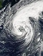 While accelerating northeastward, Hagibis developed a well-defined eye and underwent a period of rapid deepening.[25] On May 19, the JMA estimated peak 10-minute winds of 175 km/h (109 mph),[8] and the JTWC estimated 1-minute winds of 260 km/h (160 mph);[9] this made Hagibis become a second super typhoon after Mitag. At the time of its peak, the typhoon was located about 305 km (190 mi) west-southwest of the Northern Mariana Islands.[25] Hagibis only maintained its peak for about 12 hours,[8] after which the eye began weakening.[25] The trough that caused the typhoon's acceleration also caused the storm to lose tropical characteristics, and dry air gradually became entrained in the circulation.[25] On May 21, Hagibis became extratropical to the east of Japan after having weakened below typhoon intensity. The remnants continued to the northeast and dissipated south of the Aleutian Islands on May 22.[8]