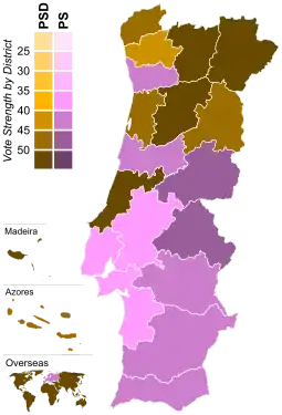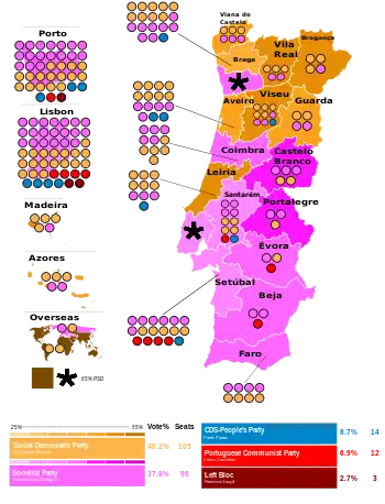 With just over 40% of the votes cast, the Social Democrats regained the status as the largest political force in Portugal, although the Socialists won almost 38% of the vote. This was, and still is, the smallest difference between the two major parties in Portugal. This short distance also appears on the electoral map, with each party winning eleven of the 22 districts, while the PS won the most populous, Lisbon and Porto. As a result, the Social Democrats fail to win the absolute majority they had between 1987 and 1995.