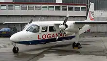 The aircraft was a British built BN2B-26 Islander manufactured by Pilatus Britten-Norman in 1989, registration G-BOMG. It was a high wing design with two wing-mounted Lycoming O-540-E4C5 piston engines, each delivering a rated 260 horsepower to a two-blade variable-pitch propeller. It had fixed tricycle landing gear, with the two main gear bogies (two wheels each) mounted on legs that extend down from the wing, just aft of the engines. It made its first flight on 20 March of that year. It was delivered to the original customer in Germany, FLN Frisia Luftverkehr, on 25 May, and re-registered in Germany as D-IBNF. On 14 August 2002, Loganair purchased the aircraft from FLN and registered it in the UK as G-BOMG.[7] Loganair's chief executive, Jim Cameron, described the Islander as "robust" and "well suited to the vagaries of Scottish weather."[8] Summarizing expert opinion of the Islander, Alastair Dalton of The Scotsman said the aircraft "had a good safety record and had proved versatile in operating from the shortest and roughest Highland runways."[2]