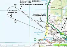 The aircraft climbed to its assigned cruising altitude of 6,000 ft (1,829 m) and left controlled airspace. The pilot kept in contact with ATC for information and advisory services. At 2359 h the controller noticed that the aircraft had not made its scheduled left turn toward Campbeltown. The controller asked the pilot to confirm his routing, and he advised the pilot that he was already west of his intended course. The pilot then made a sharp left turn to the southeast, followed by another to the southwest, toward Campbeltown. As the aircraft descended toward Campbeltown, it had not been on its approved course since it left the immediate vicinity of Glasgow.[6]:5, 47–48