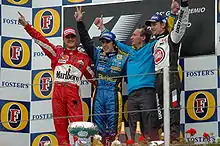 Fernando Alonso, Michael Schumacher and Jenson Button celebrate on the podium. Button was later disqualified from the race along with BAR team-mate Takuma Sato.