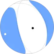 The focal mechanism of the earthquake is consistent with normal faulting on a westerly dipping fault plane. Field investigations identified 15 km of surface rupture in the form of a west-facing scarp, with up to 2.05 m of vertical displacement, although it was not possible to prove the full extent of surface faulting due to lack of time and the presence of minefields.[3] Investigations using Interferometric synthetic aperture radar (InSAR), combined with field and seismological observations, have identified two fault segments with slightly differing strikes, with the hypocenter and most of the displacement being on the more southerly of the segments.[6]