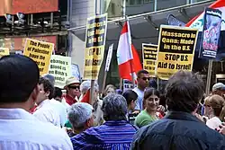 In Israel, thousands joined in protests on July 30, most of them in the Arab village of Umm al-Fahm, but also including hundreds of Gush Shalom and Meretz supporters in separate demonstrations in Tel Aviv, and smaller numbers in Haifa and the Galilee.[33] The Association for Civil Rights in Israel called for state commission of inquiry into "a blatant violation of two basic principles of humanitarian law and international criminal law."[34]