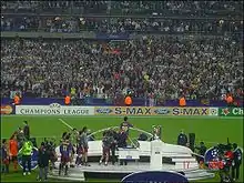 Barcelona captain Carles Puyol collected the trophy from UEFA president Lennart Johansson as Barcelona celebrated their second European Cup triumph.[21] As a result of winning the UEFA Champions League, Barcelona would face Sevilla, the winners of the UEFA Cup, in the UEFA Super Cup. The subsequent match, played on 25 August 2006, was won 3–0 by Sevilla.[29] Barcelona's victory meant they would also participate in the FIFA Club World Cup. Receiving a bye in the first round, they beat Club América 4–0 in the semi-finals to progress to the final where they faced Copa Libertadores champions Internacional, who won 1–0.[30]