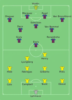 Barcelona fielded a 4–3–3 formation with Mark van Bommel and Edmílson lining up in midfield alongside Deco, ahead of Xavi and Andrés Iniesta. Lionel Messi did not feature in the matchday squad, despite returning from injury and featuring in the 22-man squad, while Henrik Larsson was among the substitutes in potentially his last game for the club. Arsenal fielded a 4–4–1–1 formation, which saw Emmanuel Eboué replace the injured Lauren, and Ashley Cole return at left-back to make only his third appearance in the competition that season due to injury. Thierry Henry was deployed as the lone striker, with Freddie Ljungberg playing off his shoulder.[19][20]