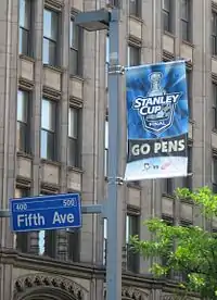 Strong support from fans continued into the playoffs, as the Penguins sold out their first two home games in 11 minutes.[19] The team erected a 12 by 16 foot LED screen on the lawn directly outside Mellon Arena, allowing fans to watch all playoff games outside of the stadium, free of charge.[20] A rally scheduled by Allegheny County executive Dan Onorato and Mayor Luke Ravenstahl took place in front of the Allegheny County Courthouse prior to Game 2 of the team's first-round series on April 11.[21] The Penguins' third game of the playoffs attracted the third-highest regional viewing audience all-time for a Penguins game.[22] The 4,200 tickets offered for the team's first two home games of Round Two sold out within 10 minutes.[23] As the playoffs advanced into the later rounds, the team had growing support from players and coaches of other teams in Pittsburgh, including the Steelers and Pirates, and many of the players attended games.[24][25] Steelers head coach Mike Tomlin watched Game 6 of the Finals outside Mellon Arena, along with 3,000 other fans.[26] Prior to the Stanley Cup Finals, Mayor Ravenstahl led a rally in the city's Market Square, which featured chanting by the several hundred people in attendance; cooked octopus was also served by Wholey's Fish Market, in reference to the Detroit tradition of throwing octopuses onto the ice.[27] The team also opened up Mellon Arena for fans to watch away games on the JumboTron during the Stanley Cup Finals; over 13,500 people attended Game 1.[28] Fans who watched the three games played in Detroit raised over $85,000 for the Mario Lemieux Foundation for cancer research.[17] The Penguins also ranked first in the league in merchandise sales.[29]