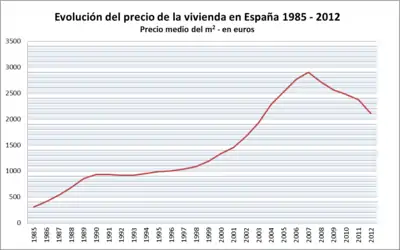 The expression Spanish real estate crisis or property crisis that began in 2008 refers to the set of economic indicators (sharp fall in the price of housing in Spain, credit shortages, etc.) that, with all their severity in 2010, would evidence the deterioration of real estate expectations and of the construction industry in Spain[1] in the context of a global economic crisis and the property bubble in Spain. Such indicators would be, mainly, the decline in units sold, the sharp fall in housing prices (more or less pronounced depending on the region) and the increase in the number of developers and construction companies declared bankrupt or in financial difficulties. Spain, however, is not the only country affected.[2] The crisis has spread to other areas, leading to the Spanish crisis of 2008-2014.