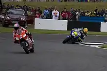 Valentino Rossi, trying to close the gap to Casey Stoner on the opening lap. Stoner went on to win the race, with Rossi finishing a distant second in the MotoGP race.
