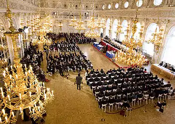 Klaus' chances to be reelected were boosted when Snítilý announced he would vote for Klaus prior to the session.[37] Surprisingly, in his address on 15 February 2008 before the joint session of parliament, Klaus stated he supported holding the presidential elections as public ballots and not as secret ballots as he demanded before.[38] Klaus also delivered a significantly more nationalistic and euroskeptical speech than the week previously. This was taken as an indication that he knew he had the votes to win and no longer needed to moderate his feelings.
