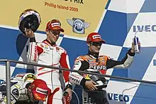 Valentino Rossi, Casey Stoner and Dani Pedrosa, celebrating on the podium after finishing second, first and third at the MotoGP race.