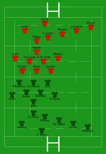 | Try: Frolick 36' c Con: Pretorius Pen: Pretorius 14' | Report[32] | Try: Roberts (2) 6' c, 40' c O'Driscoll 10' c Monye (2) 21' m, 68' c Croft 29' c Bowe (2) 47' c, 57' c Hook 74' c Ferris 80' c Con: S. Jones (6/7) Hook (3/3) Pen: S. Jones (2) 12', 17' |
