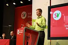 The second day included speeches from former party leader Erik Solheim and sitting deputy leader Audun Lysbakken.[4] One commentator called Lysbakken's speech "sparkling" and noted increased attention when he held the speech. Among the topics he talked about was a "renaissance" of more government involvement in the economy and a future climate crisis.[7] The new party program was described by the media as "radical" and "expansionist", however the question most asked themselves were how much of their program would be included in Soria Moria II.[7] Lysbakken then presented his proposed new party program, which was applauded by the convention audience. Before he presented the program, he said;[8]