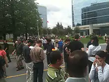 Immediately after the quake, cell phone service in Ottawa was down, possibly overloaded by callers.[32] Several windows in Ottawa City Hall shattered, and a chimney in a nearby solicitors' office collapsed.[31] Minor damage was also reported to several city-owned facilities, including two branches of the Ottawa Public Library and two municipal sports arenas, and power was out in part of the downtown Golden Triangle neighbourhood.[33] Office buildings in Ottawa and Toronto were evacuated, and cracks appeared in the Parliamentary Press Gallery building on Parliament Hill.[34] A session of the Senate of Canada was also interrupted,[35] leading to an unprecedented session of the Senate outside on the front lawn of Parliament Hill, in order that a formal adjournment for the day could take place.[36] No serious damage or injuries were reported.[34] In Toronto, Toronto Transit Commission and GO Transit service was uninterrupted, while eastbound Via Rail trains were significantly delayed.[4]