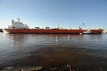 A perimeter was established around the affected area, and none of the oil had harmed local wildlife.[4] The collision occurred in a still part of the channel, which helped to limit the flow of oil both upstream or downstream. AET activated their OPA 90 response plan and called upon Resolve Marine to lighter and refloat the damaged vessel while contractors worked to contain the oil spilled.[6] While the section of the waterway the collision occurred in is largely industrial, there are marshes along shorelines in other parts that are susceptible to damage from oil spills.[7] The collision closed the Port Arthur waterway, and Coast Guard personnel could not immediately comment on how long it would take to clean the spill or reopen the channel. The only statement made regarding the time it would take to reopen the waterway was that "We're working as quickly as possible to clean up the spill," according to a Coast Guard officer.[3] By the day after the incident, about 1,100 barrels (170 m3) of spilled oil had been recovered, and most of the unrecovered oil was contained. However, according to both the Coast Guard and local officials, the possibility of currents in the channel picking up remained, and with it the potential for oil to flow downstream into marshes.[8] Four oil refineries operate in the Port Arthur area, with a total capacity of about 1.1 million barrels (170,000 m3) of oil a day. In statements, neither Exxon or Valero, which operate two of the refineries, said they expected operations to be disrupted by the collision. Neither Motiva Enterprises or Total, which operate the other two refineries, initially publicly responded to the spill.[4] In its response to the incident, the tanker's operator, AET Inc. said it was cooperating with investigators, and was prepared to bear the costs of cleanup, but noted that responsibility for the incident had not been determined. The company also refused to name the pilots in charge of the ship at the time of the collision.[8] On January 27, the tanker was removed from the waterway, and soon after, limited traffic through the channel was allowed to resume. In a statement on January 29, the Coast Guard said they hoped to allow full operations in the waterway to resume within a week.[9]