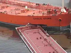 The barge collided with the tanker at about 09:30 local time on January 23, 2010,[2] in the Sabine-Neches Waterway[3] as the tanker, chartered by Exxon-Mobil from AET Incorporated to move oil to Exxon's refinery in Beaumont, Texas, moved upstream, and the barge was being maneuvered out of the harbor.[4] The collision tore a 15 × 8-foot (2.4 m) hole in the side of the tanker,[2] through 450,000 US gallons (1,700,000 L), or 1,500 tonnes, of crude oil, escaped. According to statements from the tanker's crew, the tank that was damaged contained 80,000 barrels (13,000 m3) of oil, of which 69,000 had been transferred to another tank, leaving 11,000 barrels (1,700 m3), or 450,000 US gallons (1,700,000 L) unaccounted for. According to local officials, however, there did not appear to be that much oil in the water, and some said that as little as a thousand barrels, or 42,000 US gallons (160,000 L), of oil had spilled. Coast Guard officials acknowledged that this might be the case, and that oil could have remained in the damaged tank.[5] Referring to the size of the spill, a Coast Guard officer said, "This is a big one." In response to the spill, emergency crews evacuated about 28 blocks of buildings around the site of the collision, but by the evening of the 23rd, residents had been allowed to return.[4]
