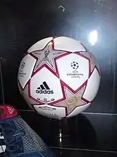 The official match ball for the 2010 Champions League final, the Adidas Finale Madrid, was unveiled on 9 March 2010. It was the tenth ball to use the "Starball" design that had become synonymous with the UEFA Champions League. Each of the stars on the ball featured an element of the logos of each of the last 10 Champions League finals, drawn in gold. In reference to the colours of the Spanish flag, each gold star has a red border, while the base colour of the ball referred to the white of Real Madrid's kit. The ball retained the "goosebump" texture of the previous two versions, but the panel configuration was changed for the Finale Madrid, with the panels following the star pattern on the ball.[22][23]