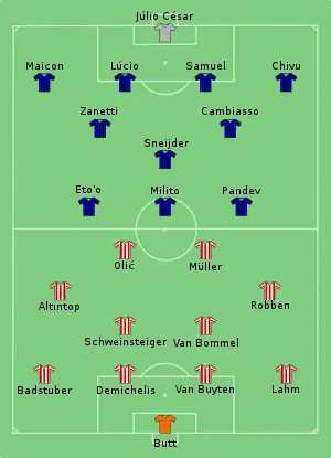 The match was won 2–0 by Inter. Inter employed a counter-attacking strategy that saw them have less possession than Bayern, but Inter were able to comfortably defend their lead.[32] Both goals were scored by Diego Milito, in the 35th and 70th minutes. Milito's first was scored following a long clearance by Inter goalkeeper Júlio César flicked down by Milito to Wesley Sneijder, who returned the pass to Milito to score. Milito's second goal came after he collected a pass from Samuel Eto'o and beat Daniel Van Buyten with the ball.[33] Milito was substituted shortly before the end of the match, allowing him to be applauded by the Inter supporters.[34] After the match, Milito stated the win brought "incredible happiness" and claimed his side deserved its victory.[35] Bayern captain Mark van Bommel conceded Inter was the "most effective team", referring to the success of Inter's counter-attacking tactics.[36] José Mourinho revealed after the match that he would likely resign from Inter to pursue the goal of being the first manager to win the Champions League with three clubs. Reports had linked him with a move to Real Madrid.[37]
