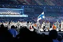 Of the flag-bearers who led their respective delegations, all but one were athletes, the exception being Fuad Guliyev, a skating official from Azerbaijan. The sport which was most represented among the flag-bearers was alpine skiing, as alpine skiers led 26 delegations. Only one delegation was led by a short track speed skater, Hong Kong, led by Han Yue Shueng.[1] Marjan Kalhor, an alpine skier and the flag-bearer for Iran, was both the first female flag bearer from her country and the first female athlete from her country to participate in the Winter Olympics.[2] It was erroneously pointed out by a Canadian TV commentator that Tomomi Okazaki was the first female flag bearer for Japan. This title goes to Seiko Hashimoto in Calgary 1988. Other prominent flag bearers included Canadian speed skater and five-time Olympian Clara Hughes, American luger Mark Grimmette, who had helped carry the American flag during the 2002 Winter Olympics, and Czech hockey player Jaromír Jágr. Hughes is the only Olympian ever to win multiple medals at both the Summer and Winter Olympics.[3]