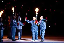 The flag was carried into the stadium. It was then transferred to members of the Canadian Forces' Soldier On program: Sgt. Karen McCoy, and Master Cpl. Mike Trauner, who then raised the flag.[6]