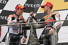 Race winner Casey Stoner, toasting the champagne with third place Andrea Dovizioso on the podium at the MotoGP race.