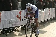 Three days later, Rollin finished tenth in Dwars door Vlaanderen.[32] Bonnet finished sixth in the succeeding E3 Prijs Vlaanderen – Harelbeke three days later,[33] after making his way into the breakaway, with Chainel also making it into a secondary breakaway from the main field after pressure from the Garmin–Cervélo squad. He eventually finished the race 15th.[33] At the beginning of April, Meersman earned his second runner-up placing in the space of three weeks, finishing behind Renaud Dion (Bretagne–Schuller) in Route Adélie; Meersman had been one of seven riders in contention for victory in a breakaway in the closing stages.[34][35] Meersman followed up that performance two days later, in the inaugural Flèche d'Emeraude, by finishing fourth in the final mass sprint.[34] Hutarovich finished third in the Scheldeprijs three days later,[36] having avoided a crash in the finishing straight which eliminated several riders from contention for the top placings. Casar won Paris–Camembert later in April, by making a late ten-rider selection which included teammate Fédrigo, who worked to set Casar up for a sprint on the uphill finish. Casar was easily the strongest, ahead of Romain Hardy and Julien Antomarchi.[37]