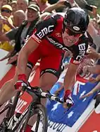 The opening stage's uphill finish of Mont des Alouettes was won by Philippe Gilbert, who took the first yellow jersey as leader of the general classification. He also led the points and mountains classifications.[42] Garmin–Cervélo were the fastest in the 23.0 km (14 mi) team time trial on the second stage, four seconds ahead of second-placed BMC Racing Team. This put Garmin's Thor Hushovd, who was third in stage one, into the yellow jersey.[43] Tyler Farrar won the third stage from a bunch finish. José Joaquín Rojas of Movistar Team, third on the stage, took points classification's green jersey.[44] The following day, a five-rider breakaway group had led the stage after 9 km (6 mi), before the peloton caught on them at the foot of the Mûr-de-Bretagne climb. After a series of attacks, a group of nine riders moved clear, and Cadel Evans won the subsequent sprint finish. Evans took the polka dot jersey as leader of the mountains classification.[45] Mark Cavendish won stage five from a bunch sprint, with second-placed Gilbert taking the green jersey.[46] The sixth stage was won by Team Sky's Edvald Boasson Hagen, who won the hilly bunch sprint in Lisieux. Johnny Hoogerland (Vacansoleil–DCM) took the polka dot jersey.[47]