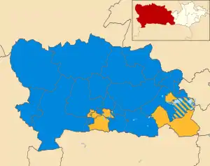 At the last election in 2007 the Conservatives won a majority of 20 seats, with 36 councillors, compared to 16 for the Liberal Democrats.[2] By the time of the 2011 election 2 seats were vacant after the death of Liberal Democrat councillor Keith Lock from Mortimer ward and the resignation of Conservative councillor Ellen Crumly from Thatcham Central ward.[3]