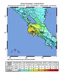 The 2012 Costa Rica earthquake occurred at 08:42 local time (14:42 UTC) on September 5. The epicenter of the 7.6 Mw earthquake was in the Nicoya Peninsula, 11 kilometers east-southeast of Nicoya.[6] A tsunami warning was issued shortly afterwards, but later cancelled. Two people are known to have died, one from a heart attack and another, a construction worker, crushed by a collapsing wall.[7] It was the second strongest earthquake recorded in Costa Rica's history, following the 1991 Limon earthquake.[8]