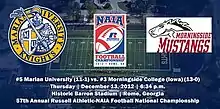 The 2012 NAIA Football National Championship was played on December 13, 2012 as the 57th Annual Russell Athletic NAIA Football National Championship. The game matched the once-beaten and 5th-ranked Knights from Marian University against the undefeated and 3rd-ranked Mustangs from Morningside College. The game matched two teams making their first appearance in the championship game, assuring someone would win the title for the first time. The teams proved to be evenly matched, and the outcome was not decided until the winning points were scored in the first round of overtime. With their winning field goal, the Marian Knights prevailed, 30-27 in the first overtime game in NAIA football championship history.[1]