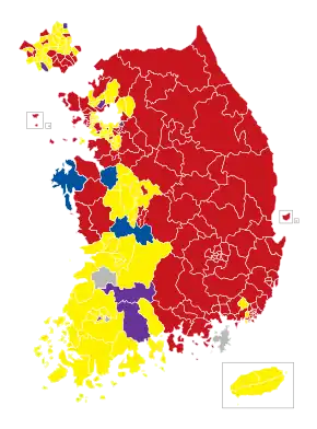 The result showed considerable regional variations. The DUP and its coalition partner the UPP made significant gains in the north-west of the country, winning a combined total of 26 new seats in Seoul, four in Incheon and 14 in suburban Gyeonggi-do. Altogether the DUP-UPP coalition won 70 of 112 seats in this region, a gain of 44. They also maintained their dominant position in Jeolla and Jeju, winning 31 of 33 seats, a gain of three. Had the liberal parties made comparable gains in the eastern half of the country, they would have won the election. They won only 13 seats of 100 in these provinces, a net gain of one. In Chungcheong, Gangwon and Gyeongsang, the Saenuri Party made gains from the DUP and the Liberty Forward Party. The liberal parties failed to make significant gains in the southeast, a traditionally conservative region.[39] The Saenuri Party also took seats from independent members across the country.[40]