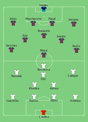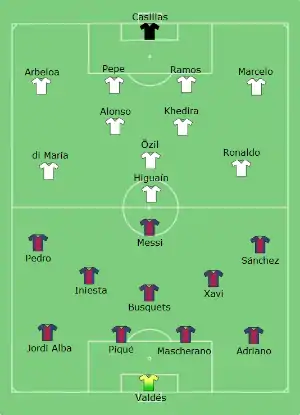 The 2012 Supercopa de España was a two-legged Spanish football match-up that took place on 23 and 29 August 2012 between the champions of 2011–12 La Liga, Real Madrid, and the winner of the 2011–12 Copa del Rey, Barcelona. Barcelona and Real Madrid drew 4–4 on aggregate, with Real Madrid winning on away goals for their ninth Supercopa de España title. This was the first occasion the trophy was won on the away goals rule.