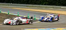 A test day was held on 9 June, two weeks prior to the race, and required all entrants for the race to participate in eight hours of track time divided into two sessions.[20] All 56 entries were involved as well as a fourth Audi R18 e-tron quattro driven by Marco Bonanomi for 2014 tyre testing, a Signatech Alpine A450 for Paul-Loup Chatin and Tristan Gommendy and a spare Level 5 Motorsports HPD ARX-03b tested by Scott Tucker. Two Team Endurance Challenge-entered Le Mans Prototype Challenge Oreca-FLM09s also participated.[21] Wet weather swept the area during the day and had Audi set the fastest time with a 3 minutes, 22.583 seconds lap from Duval in the No. 2 car at the end of the second session. Lucas di Grassi in the sister No. 3 entry followed in second and Lotterer completed an all-Audi top three lockout in third. Toyota placed fourth and sixth with its best times coming from Sarrazin and Alexander Wurz; they were separated by Bonanomi's Audi.[22] During the first session, Duval was distracted by an unidentified object hitting his windscreen and heavily damaged the No. 2 car in the wall alongside the track at Tertre Rouge corner.[21][22] Olivier Pla's OAK Racing Morgan-Nissan was the fastest LMP2 car with a late second session effort of 3 minutes, 38.801 and he was eight-tenths of a second faster than Nelson Panciatici's Signatech Alpine.[22] LMGTE Pro was topped by Peter Dumbreck for Aston Martin Racing while Jamie Campbell-Walter also helped the marque lead in LMGTE Am.[22] Crashes from Tracy Krohn of Krohn Racing at the right of Mulsanne corner, AF Corse's Giancarlo Fisichella leaving the same turn and Dominik Kraihamer for Lotus in the Porsche Curves led to stoppages during both sessions.[21]