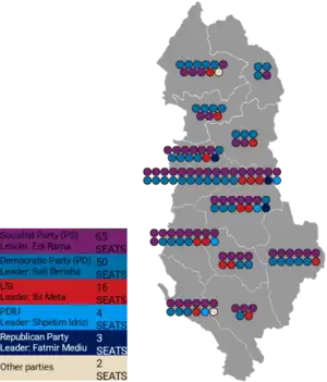 16. 1 2 3 "Sondazhi i Piepoli: E majta merr 73 mandate, e djathta 66 mandate, FRD 1 mandat – Gazeta Tema". gazetatema.net. Archived from the original on 18 June 2013. Retrieved 25 January 2014.