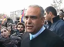 Sargsyan's main opponent Raffi Hovannisian claimed victory due to alleged electoral fraud. In days following the election, mass protests take place both in Yerevan (Freedom Square in particular) and other cities and towns throughout Armenia. Hovannisian urged Sargsyan to accept "people's victory" and concede his defeat.[3] Hovannisian called the movement 'Barevolution', a portmanteau of 'barev' (բարև, 'hello') and 'revolution', referring to his habit of walking up to people and greeting them during the election campaign.[4][5]
